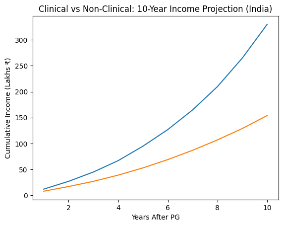 Here is the 10-year cumulative income projection graph for Clinical vs Non-Clinical branches (India model).